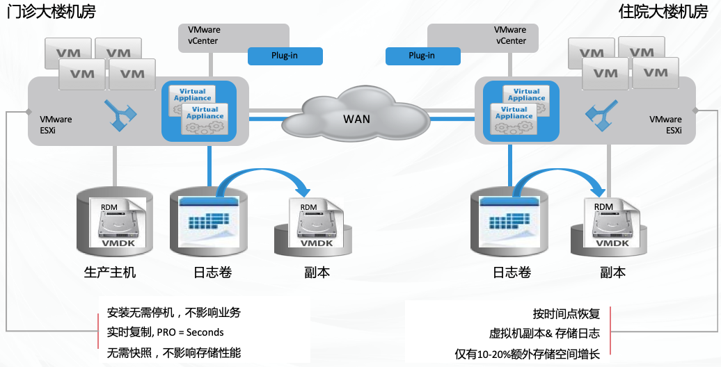高效灵活:支持本地+远程复制,在给予零 数据丢失保护的基础上,支持同步及异步数据复制,在复制链路上给予压缩和消重功能,有效节约带宽和运营成本;